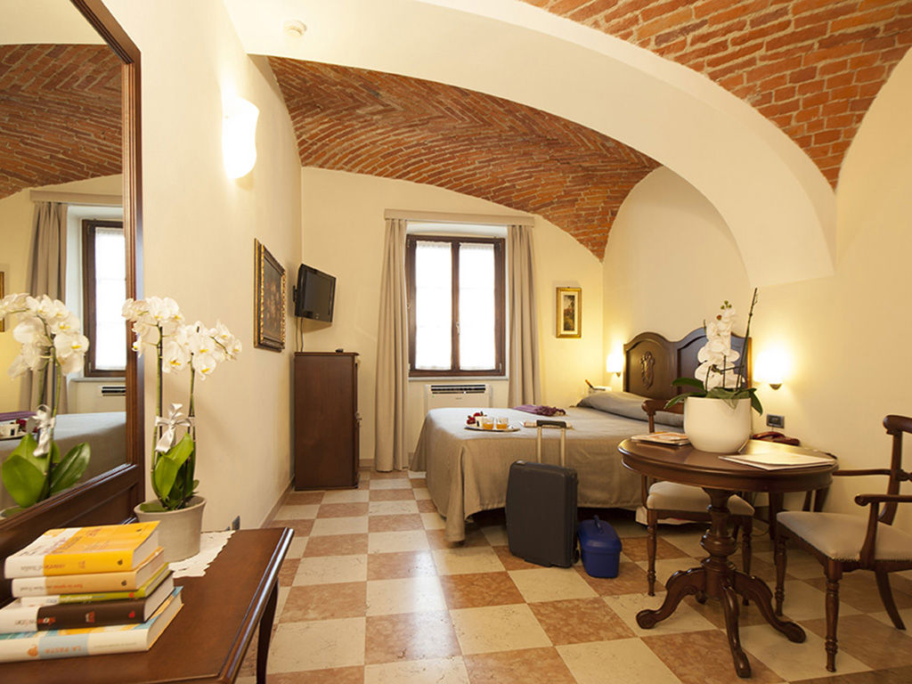 Le camere dell’albergo sono dedicate ai grandi Cru dei prestigiosi vini di Langa e Roero e si raggiungono attraverso ampi corridoi che si affacciano sul quadrilatero interno.